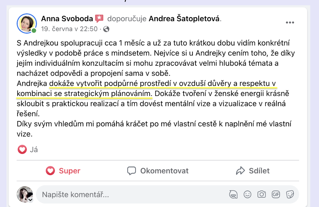 Rozhodla jsem se riskovat. Opustila jsem jistoty, zkusila online podnikání a po roce se úspěch nekonal. Aspoň jsem si to tehdy myslela. Vrátila jsem se do firem a znovu šplhala nahoru. Byla jsem žádaná, „ta Andrea, kterou všichni chtějí zažít“. Ale i když jsem vydělávala víc než kdy předtím, cítila jsem, že takto to dál nejde.